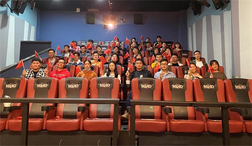 影片放映完毕,全体同志挥舞手中的国旗,高声合唱电影片尾曲《我的祖国》,并进行合影留念。