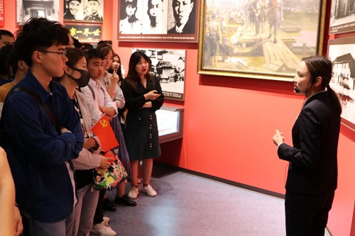 下午14时许,全体发展对象乘车抵达陈列馆。在讲解员的带领下,所有发展对象以党支部小组为单位进入展厅参观。党史陈列馆布展以“敢教日月换新天-中国共产党湖南历史陈列”为主题,以历史轴线为脉络,讲述了“开辟新天地-新民主主义革命时期”、“描绘新画卷-全面建设社会主义时期”、“谱写新篇章-改革开放时期”三个不同历史时期发生的重大事件。讲解员声情并茂地讲解了英雄夫妻缪伯英与何孟雄的故事、中国共产党著名的女将文武双全的神枪手胡筠的故事、优秀的共产党员陈树湘自断肝肠宁死不屈的故事、以及红军陈毅安无字家书的故事等等。
