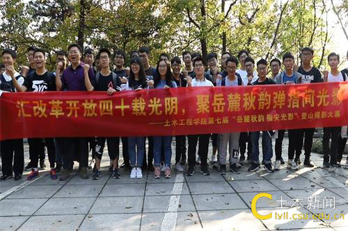2018年11月24日,土木工程学院在岳麓山成功举办第七届“岳麓秋韵,指尖光影”登山摄影大赛。土木安全类2018级全体学生、班导师、班导师助理及高年级“一对一共成长”学生参加。立足改革开放四十周年,本次登山摄影大赛将岳麓山抗战旧址参观与团体实践活动相融合,把改革开放四十年摄影展览和新时代新征程教育相结合,旨在落实全国教育大会上习近平总书记提出的“培养德智体美劳全面发展的社会主义建设者和接班人”教育目标。