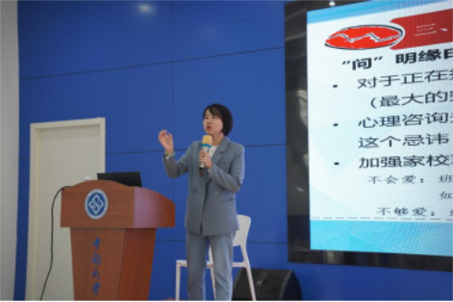 校心理中心谭鑫老师作了题为“运用‘望闻问切’四诊法,打开大学生心灵之门——面对学生心理问题班导师可以做什么”的主旨分享,她以“望闻问切”四诊法结合多个心理问题案例向与会老师分享了如何识别和解决学生心理问题,她提出要从学生的角度出发,多渠道分析学生出现心理问题的症结,从而达到解决根本问题的效果。