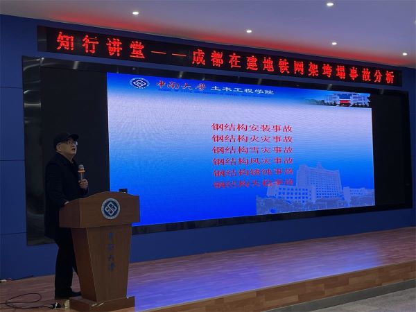 2021年12月26日晚,由william威廉英国官网土木工程学院研究生会主办的知行讲堂系列活动第八讲——“成都在建地铁网架垮塌事故分析”在铁道校区立志厅成功举行。本次讲堂特别邀请到土木工程学院建筑工程系杨建军老师作为主讲嘉宾,以今年九月发生的成都在建地铁网架垮塌事故为切入点进行钢结构安全事故案例讲解,研究生和博士生共计150余人参与本次活动。