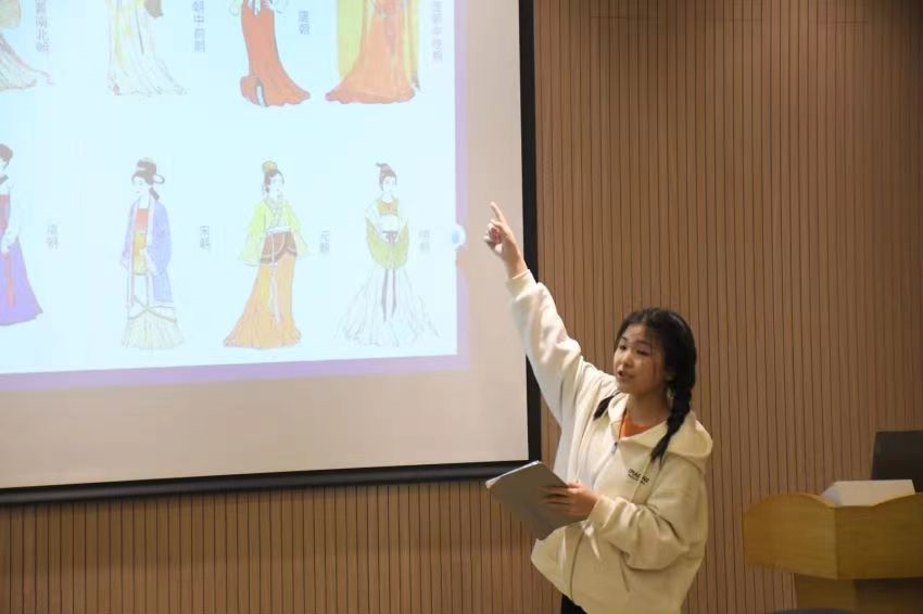 会议伊始,志愿者主持进行了汉服试穿环节,国际学生们身着祥云仙鹤、盘龙金纹、团花簇锦的美丽汉服。该项活动不仅使国际学生了解了汉服的交领、系带等基本结构,同时也让他们领略到了汉服的独特魅力。