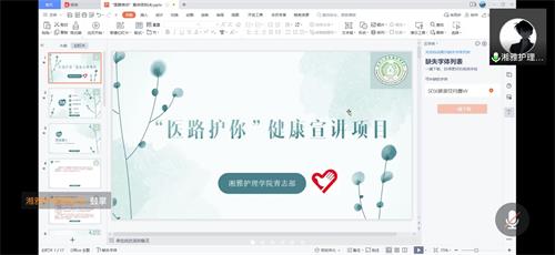 会议开始,主持人首先对志愿服务进行了简单介绍。随后,四院优秀志愿者代表从活动背景、活动过程、活动意义等方面分别向大家分享了所在学院的特色志愿服务项目,包括资安院的小黄帽安全教育志愿服务活动、化工院的“聚力科学,助飞国梦”科学实验进校园志愿活动、冶环院的“一笔护隐私,一画保权益”隐私保护主题志愿者活动以及湘雅护理学院的“医路护你,健康宣讲”志愿服务活动。