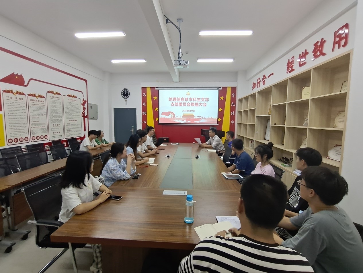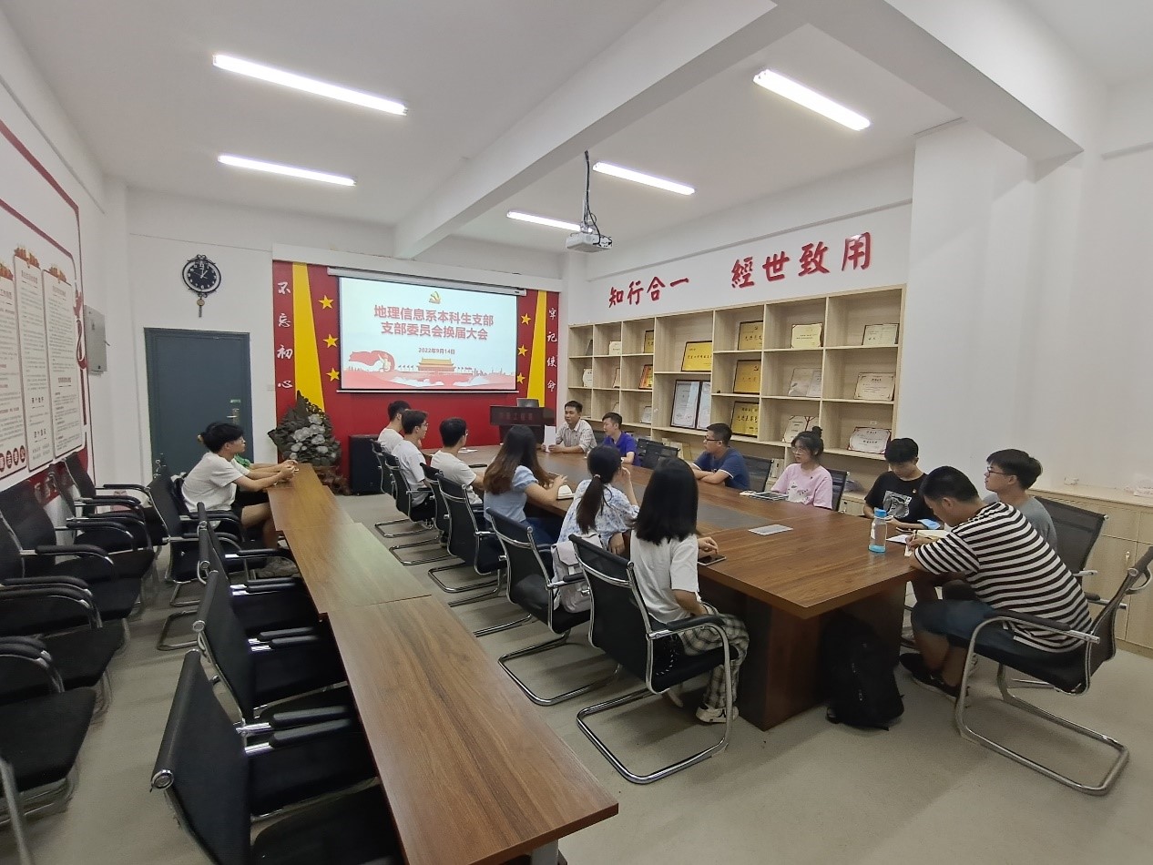 2022年9月14日19:00,地理信息系本科生支部支部委员会换届大会于新校区地科楼112会议室开展,会议由强俊同志主持,支部全体同志出席本次会议。