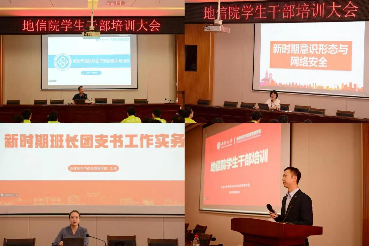 9月25日上午,地信院学生干部培训大会于地科楼127、地科楼214、地科楼424顺利召开。本次培训由地信院院长戴前伟、地信院党委副书记李建军、地信院团委书记刘琦主讲,并邀请本科生及研究生代表进行经验分享。地信院全体本研班长团支书参与培训,培训会由学院2022级本科生辅导员刘凯主持。
