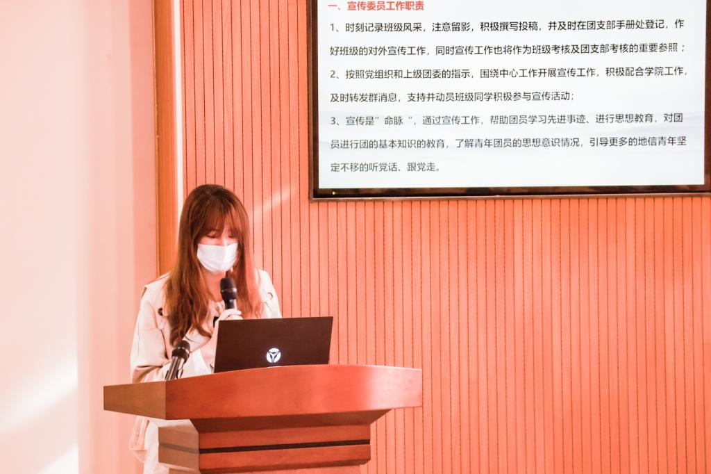 紧接着,程文妍同学向大家讲解了学院团委宣传工作特色栏目和班团活动投稿机制,介绍了宣传委员工作职责、撰稿要求和投稿机制、学院特色投稿栏目、团支部风采展示渠道等内容,号召大家充分发挥宣传委员作用,积极做好班团宣传工作。