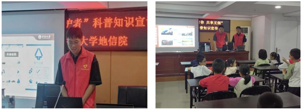 活动伊始,宣讲团成员曾晨熠以生动活泼的语言和图文并茂的多媒体展示,向孩子们娓娓道来地球面临的环境危机,从雾霾锁城到水源污染,从土壤侵蚀到生态失衡,每一幅画面都触动着孩子们的心弦。随后,金冠璋同学接棒,借助生动的科普视频和细致入微的解说,向孩子们展示了垃圾分类的科学方法及其深远意义,将抽象的概念转化为具体可行的行动指南,激发了孩子们的环保使命感。