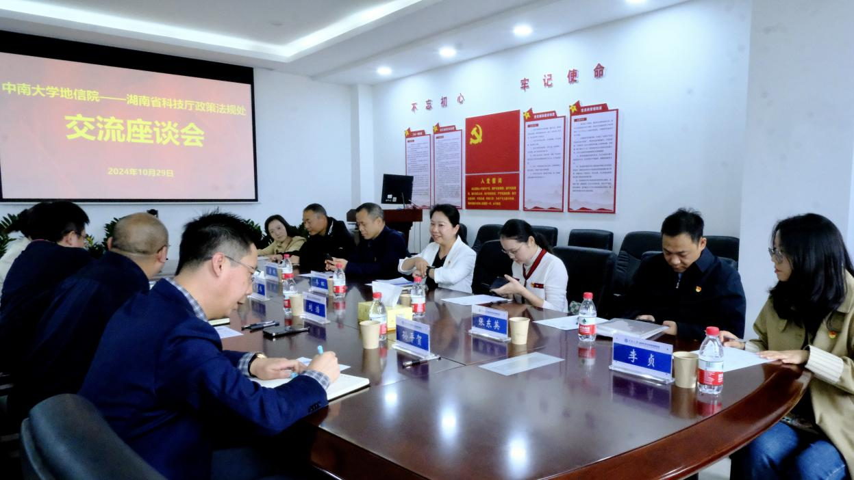 为了加强政府部门与高校交流合作,进一步推进科研等方面相关政策的落实,10月29日下午,湖南省科技厅政策法规处韦虹处长一行莅临william威廉英国官网地球科学与信息物理学院,于地科楼214室开展交流座谈会。学院院长李志伟、党委副书记刘浩、党委委员孙平贺、团委书记刘琦热情接待。会议由刘浩副书记主持。