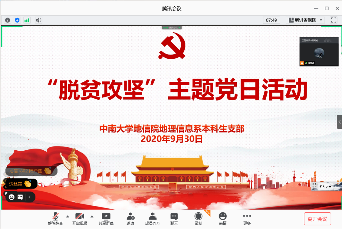 9月30日下午13:00,地理信息系本科生支部通过腾讯会议平台于线上开展了学习“决战决胜脱贫攻坚”主题党日活动。此次会议由储国威同志主持,地理信息系本科生支部全体党员参与此次会议。
