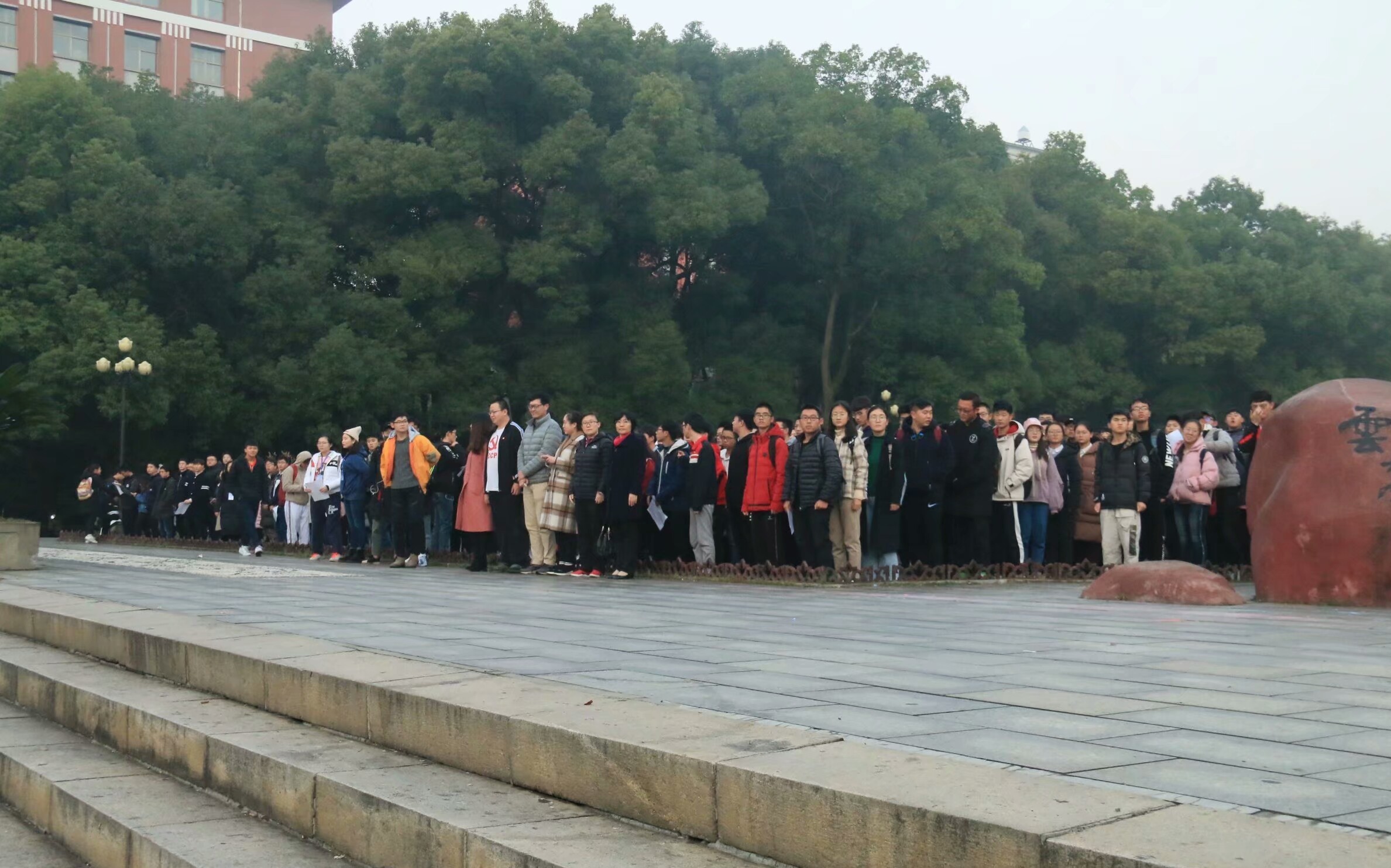 升旗仪式还未开始,老师和同学们便已早早地来到了国旗台前的草坪上。到场的他们以庄严的神情和饱满的状态静候着国旗的升起和飘扬。