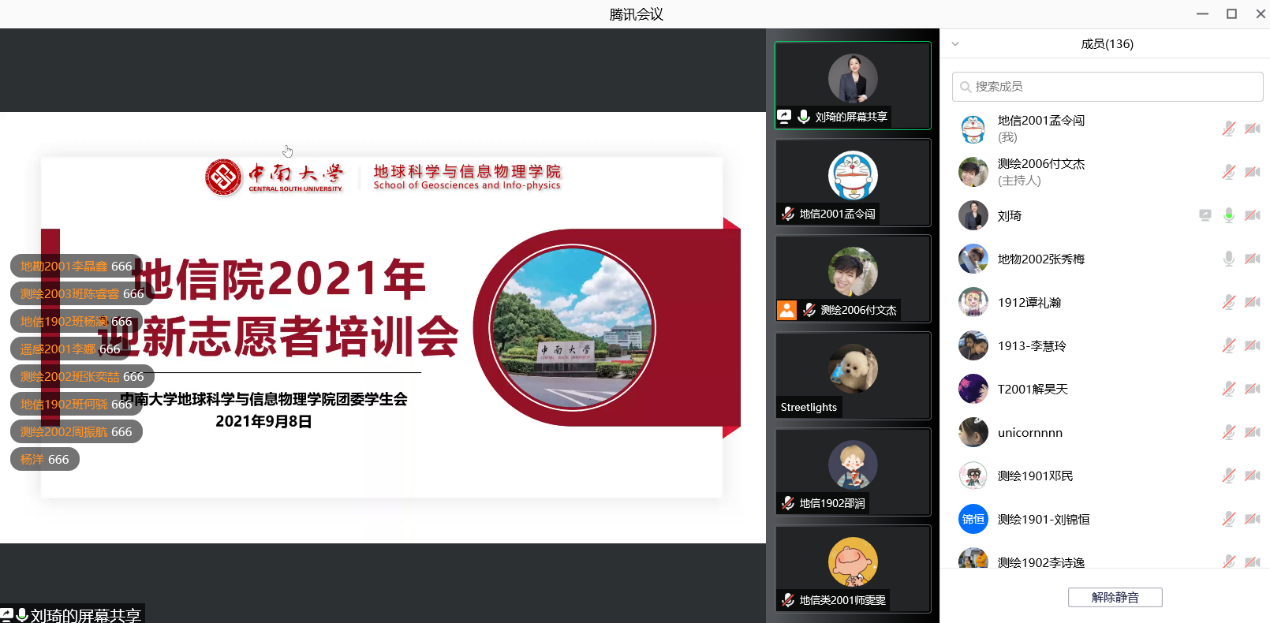 9月8日21:00,为了确保21级新生顺利开学,地信院2021年迎新志愿者培训会议通过“腾讯会议”以线上方式顺利举行。会议由院团委书记、21级辅导员刘琦老师主持召开,所有迎新志愿者参加本次会议。
