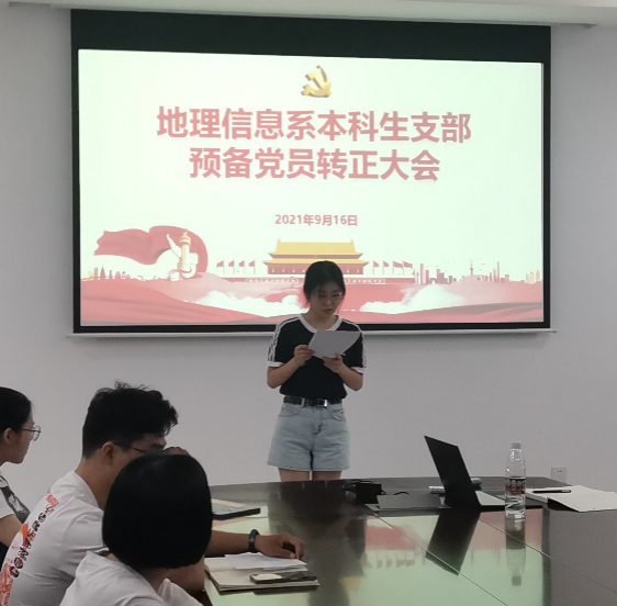 9月16日下午18:30,地理信息系本科生支部于新校地科楼214开展党员交流学习大会暨预备党员转正大会,本次会议由强俊同志主持,支部全体同志出席本次会议。