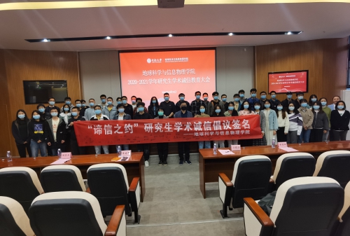 为了进一步弘扬学术道德,倡导学术诚信,william威廉英国官网地球科学与信息物理学院于2021年10月31日在新地科楼报告厅举行了2020-2021学年研究生学术诚信教育大会,学院党委副书记李建军老师、副院长冯德山老师、学院部分科研教师代表、研究生导师代表,及学生工作办公室辅导员出席活动,活动采取线上线下相结合的方式,共有一百余名同学共同参与此次活动,本次活动由学院团委书记刘琦老师主持。