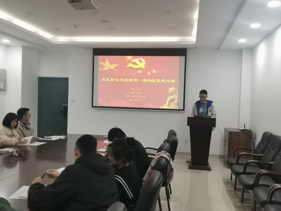 会议首先进行的是微党课比赛。支部成员自由组队,共分为四组,所选主题有湖湘红色文化——现代人的坚守、湖湘红色文化——刘少奇同志、不忘初心,牢记使命——湖湘红色英烈传、湖南红色文化——湖南农民运动,在汪晓龙同志介绍本次比赛规则后,每组根据抽签顺序派代表进行讲授。在讲解过程中,每一位党员都认真的聆听并学习,深深为湖湘红色文化动容,更加坚定自己的入党初心,决心担负起新时代的使命。