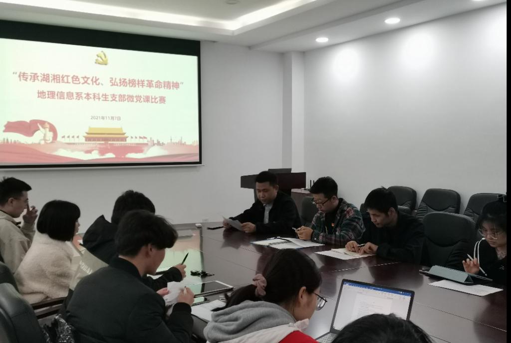 11月7日晚上19:00,地理信息系本科生支部于新校区地科楼214会议室开展湖湘红色文化微党课比赛暨腐败案例学习会。本次会议由强俊同志主持,支部全体同志出席本次会议。