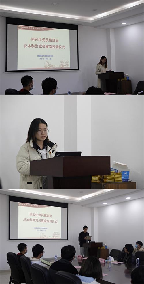 为了响应学校号召,进一步发挥学生党员的先锋模范作用,营造学院良好的学风、寝室氛围,促进党员工作透明化,更好地实现学生之间的互相督促和帮助。11月24日下午14:30,地球科学与信息物理学院在地科楼214会议室郑重举行了研究生工作室党员值班岗及本科生党员寝室授牌仪式。出席本次授牌仪式的领导老师有,地信院党委书记邵拥军教授,地信院党委副书记李建军老师,地信院团委书记刘琦老师,地信院20级辅导员、地质资源系本科生支部书记杨晨雨老师,地信院20级辅导员、地质工程系本科生支部书记杨通田老师,地信院研究生辅导员田可老师。本次仪式由团委书记刘琦老师主持,研究生及本科生党员代表共同参与。