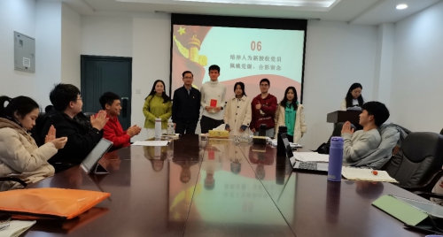 会议第四项,由李昱熹同志主持开展预备党员接收大会。蔡跃辉等五位同志逐一向党组织汇报自成为入党积极分子以来对党的认识、入党动机和在校表现等。随后培养人向大会介绍其主要政治思想、学习生活等情况,支部委员会向大会报告其现实表现的考察情况并提交支部大会讨论。经与会正式党员不记名方式投票表决 ,蔡跃辉、齐国恒、王勇、邓卓胜、王正东五位同志均获得6票赞成、0票反对、0票弃权,五位同志被支部正式接收为预备党员,并由培养人为其配佩戴党徽,随后其与培养人、材料监督人合影留念。