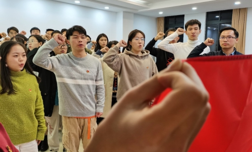 会议第五项,在支部书记杨通田的带领下,全体支部同志起立宣读入党誓词。