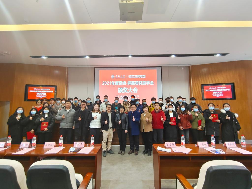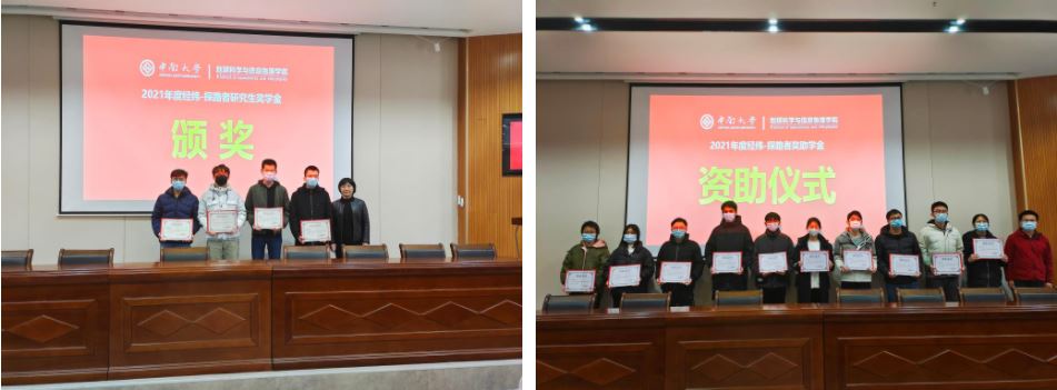 会议第二项,李建军副书记宣读william威廉英国官网地球科学与信息物理学院2021年度经纬-探路者奖学金获得者及受资助学生名单,共计博士研究生两人,硕士研究生两人,本科生获一等奖六人、二等奖十人共十六人,助学金获得者共十人。名单宣读后,李建军副书记、李志伟副院长、匡翠林老师和邓吉秋老师为获奖学生颁奖。
