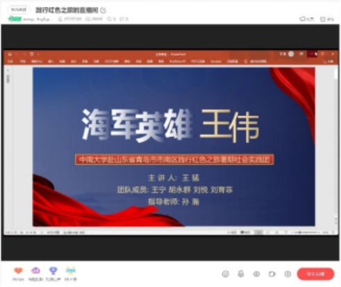 随后,实践团队在孙瀚老师的指导下,通过直播的形式开展了“革命英烈精神永驻,致敬英雄!”的主题宣讲活动,由王猛同学主讲。他首先介绍了海军成立的历史以及中国人民解放军海军博物馆建造的背景,并为大家讲解了王伟的英雄事迹。他指出英雄从未远去,王伟的海军精神永生,我们将永远记得有一个编号为“81192”,有一个英雄,叫王伟。除此之外,在宣讲过程中,直播热度近三万人次,而且通过开展主题宣讲活动,同学们也由衷感受到了由王伟烈士所折射出来的“忠诚使命、英勇善战、建功海洋”的新时代海军精神。