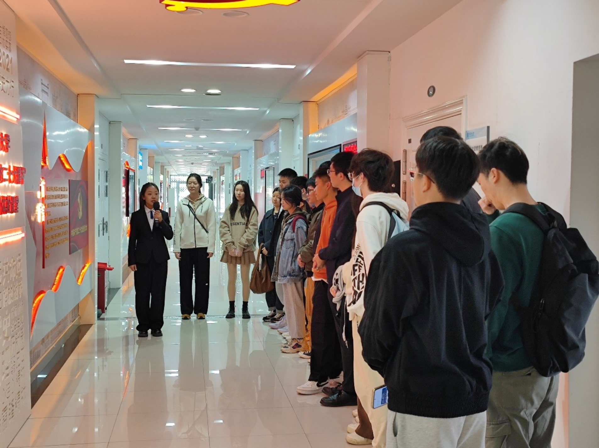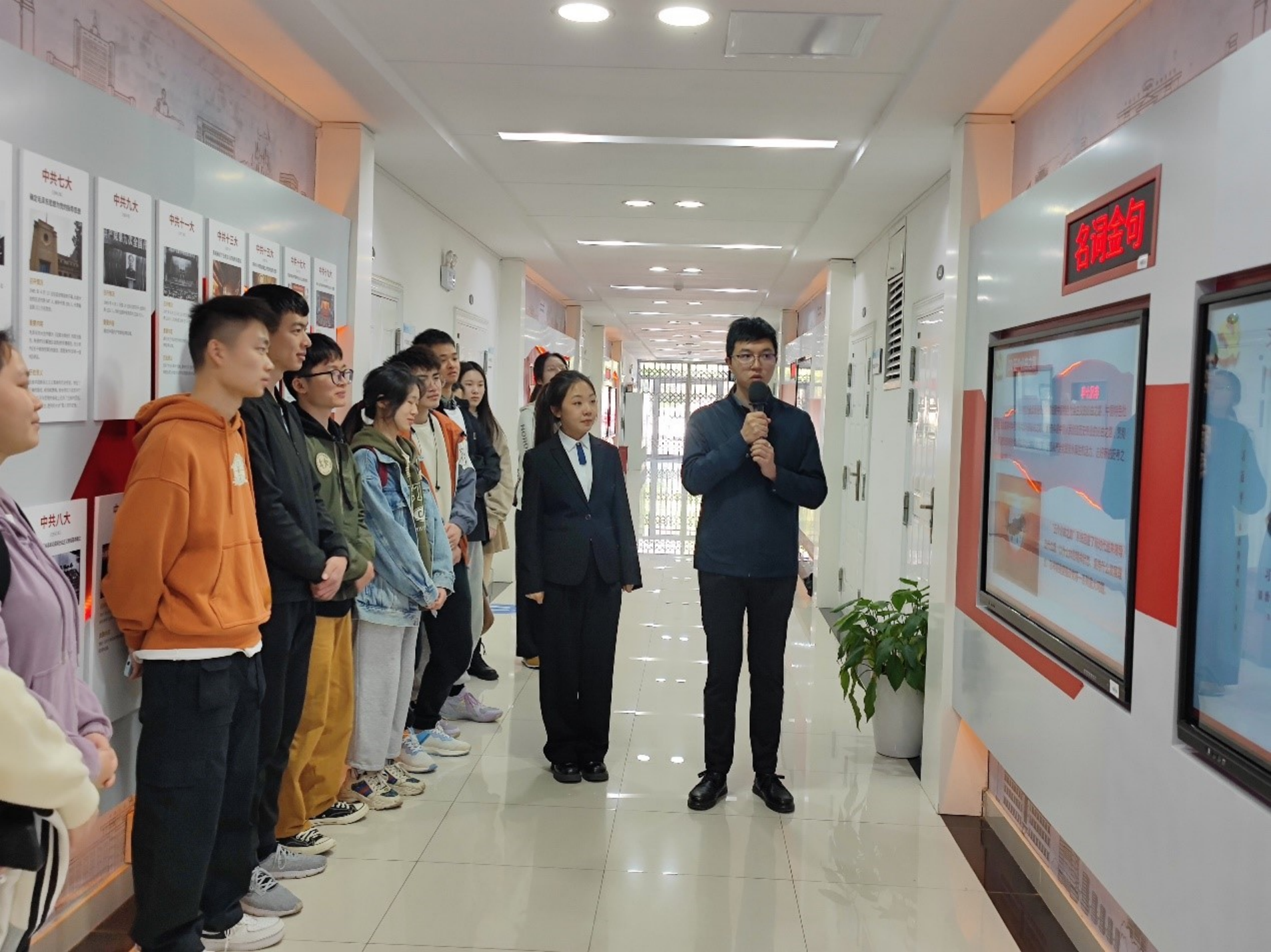 在讲解员引导下,我们按照历史的时间线学习了中国共产党的百年光辉历程以及二十大召开的盛况。本次课堂学习分为了前言部分、大会盛况、光辉历程、非凡十年、理论创新、使命任务、发展新局、名词金句和学习书单、代表风采、视听盛会十个章节。