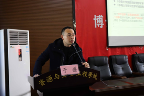 最后,于谦老师以学校对学术诚信相关要求为引,以国内外学术不端案例为警示,以老师们对中南学子的殷殷期盼为灯塔,向资源与安全工程学院研究生学子提出了实事求是做科研、诚实守信备考的要求,期待资源与安全工程学院学子能秉承优良的学术传统,以求真务实的姿态出现在更高更广阔的舞台。
