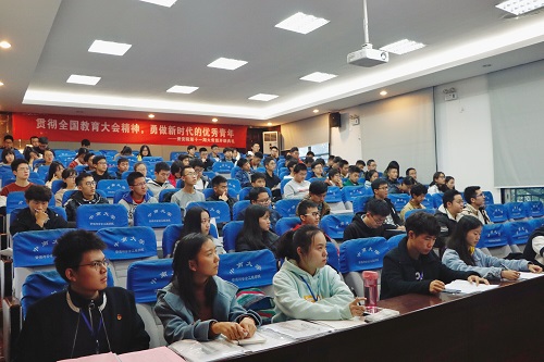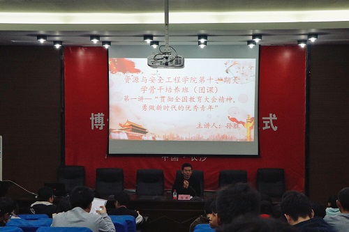 在激昂的《光荣啊,共青团》声中,开班仪式结束,第一次培训正式开始。主讲人孙胜副书记结合习总书记在全国教育大会上提出的“立德树人,发展教育”思想,向全体学员传达了新时代青年为国家发展而奋斗,肩负民族复兴的时代责任,加强个人品德修养,增强综合素质与能力的必要性。