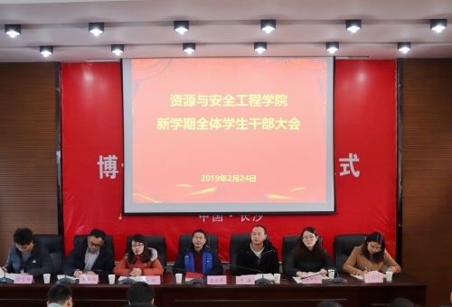2019年2月24日15:00,资源与安全工程学院新学期全体学生干部大会于采矿楼T302报告厅顺利举行。本次会议由学工办主任李欢老师主持,党委马国荣副书记、学工办辅导员及全体学生干部到场参与。