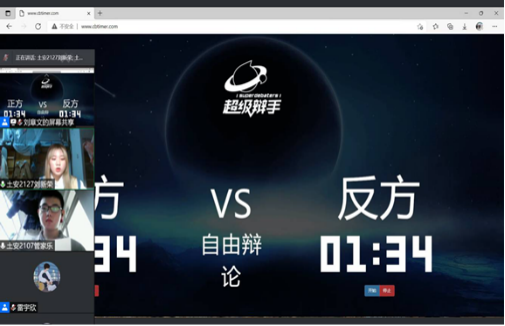 本次招新赛以线上的方式进行并由辩论队队长王亚芳同学以及毛赛同学、菅昊同学和李瑞圆同学担任评委。