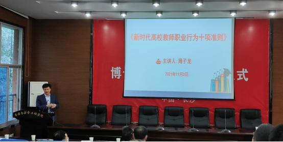 周子龙副院长首先发表关于《新时代高校教师职业行为准则》的重要讲话。讲话中指明师德师风是评价教师队伍素质的第一标准,明确新时代教师职业规范,要求结合师德师风建设长效机制,开展十大准则的学习贯彻。