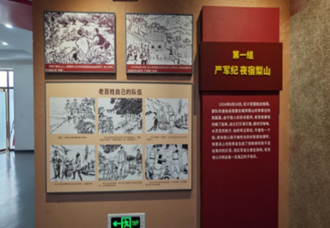 夜宿梨山党性教育基地中,仍有支部在其中开会与讨论,无时无刻都在提醒着前来学习的同志们,历史不能忘记,无时无刻不在暗示着历史与现实的交织与融合。在此地工作与学习,对党员干部,有着更高的要求,他们的身上也肩负着更加艰巨的革命精神的传承任务,他们是队员们学习的榜样。进入夜宿梨山党性教育基地之中,队员们看到了科学技术在党史宣传中的运用—各种先进的投影设备以及投影触控式的仿真枪械和地形模拟器让队员们身临其境地体会到红军在武器装备落后的条件下,利用自身熟悉地形的优势与敌人展开斗争的情景。同时在电子讲解员的讲解下,队员了解到“夜宿梨山,秋毫无犯”的故事:那是一段讲述了长征途中红军战士虽饥渴难耐,但仍严守铁一般的纪律,没有摘老百姓的一颗梨,甚至帮助老百姓把梨子堆成一堆方便他们收集的故事。故事听起来很简单,但是在当时的环境下,这种不拿老百姓一针一线的行为是闻所未闻的,这种一切为了劳苦人民群众谋福利的军队是前所未有的。从此这段故事便作为长征路上的一段佳话,“夜宿梨山,秋毫无犯”是中国共产党一切为了人民精神最好的体现。