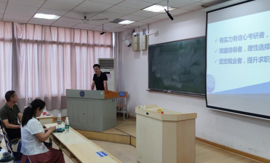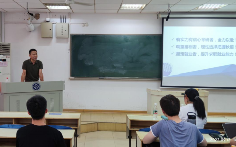 首先,黄亚副书记介绍了学院的升学就业基本情况,分析了同学们面临的升学、就业形势。黄亚副书记说,人生很漫长,但紧要处只有几步,希望考研信念坚定的同学们心无旁骛,努力备考,最终能如愿,还有一部分同学应在充分认清形势与自我的基础上,在人生关键时期做好理性决策,把握校园秋季招聘的求职就业关键期,实现高质量就业。