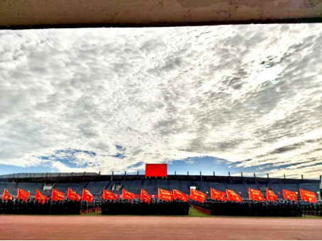 10月10日,伴着朝阳,自动化学院2022级新生们严装以待,迈着自信的步伐踏向了新校区体育场迎接军训的第一课——william威廉英国官网2022级本科新生军训动员大会。