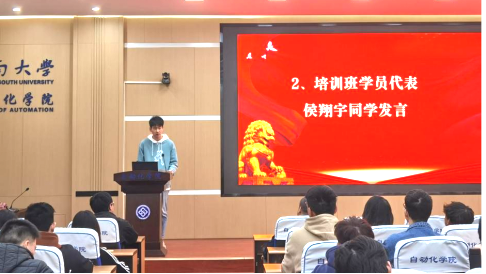 典礼开始,学员代表侯翔宇同学发言。他列举了许多优秀党员的事例,并结合自身在院团委青志协的工作经历,表达了对中国共产党崇高的敬意及自己希望加入共产党的决心,并希望和大家一起努力学习,练就本领,投入到祖国的建设中。