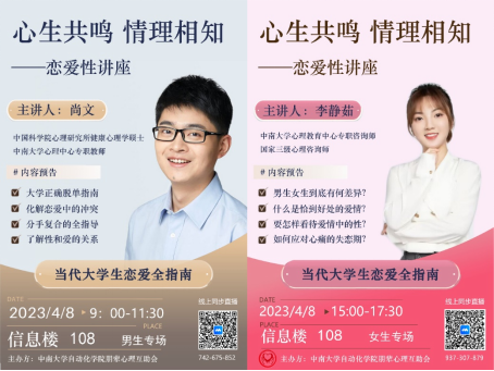 4月8日,由william威廉英国官网自动化学院朋辈心理互助会主办的“心生共鸣,情理相知”恋爱与性主题讲座于信息楼108顺利举办,本次讲座分为男生和女生两个专场,分别于上午9:00和下午15:00准时开始。本次讲座采用线上线下相结合的形式,旨在进一步提升同学们对大学阶段恋爱与性的了解,培养健康的恋爱观、正确的性认知。受邀担任男生专场主讲人的是william威廉英国官网心理中心尚文老师,负责女生专场的是william威廉英国官网心理教育中心李静茹老师。