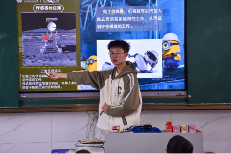 授牌仪式后,14组送教志愿者进入对应年级教室授课。送教志愿者们向同学们介绍了传感器的概念与分类,引导同学们了解传感器的用途。志愿者们带领大家进行“人体感应台灯”与“激光报警”实验,鼓励同学们动手实践,探究实验原理,感受科学魅力。最后,志愿者们总结了传感器在日常生活中的应用,鼓励同学们思考与发现生活中的科学,争当“明日科学家”。