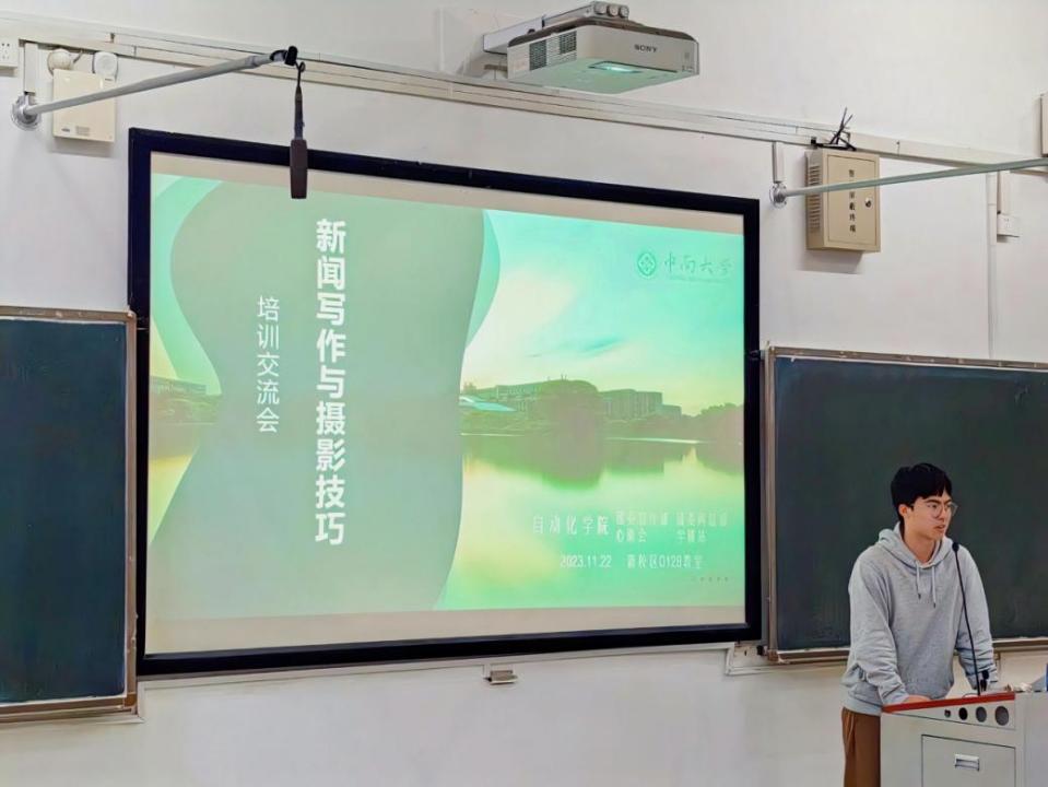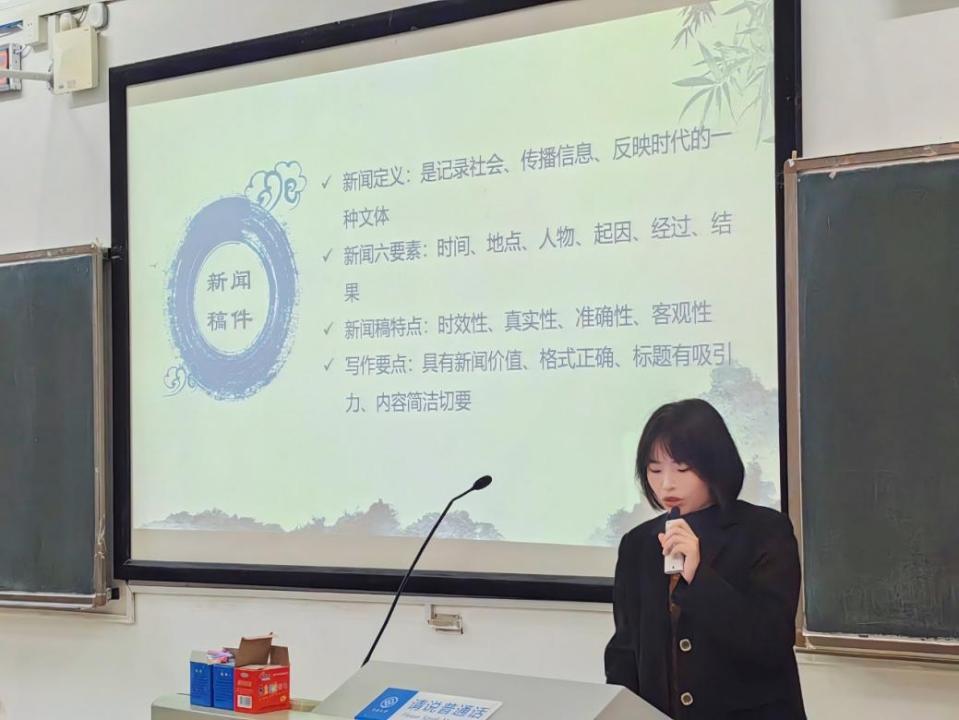 宣传专干徐雪婷讲解了新闻写作的注意事项。她为同学们讲解了新闻定义、特点和构成要素,依次讲解了新闻稿件的格式、标题、开头、正文、结尾的要求与注意事项。接着,她总结归纳了学生们写新闻稿存在的常见问题,提醒同学们在新闻写作时要注意避开常见误区,规范新闻写作。
