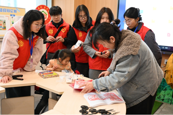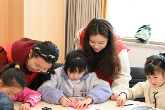 随后,李子童画机构负责人老师向小朋友们介绍了剪纸艺术的深厚底蕴与独特魅力,并对即将开展的剪纸转印活动进行了详细演示。在老师的详细指导与有序组织下,志愿者们将手工工具分发至每一位小朋友,并一对一地与小朋友开始剪纸手工之旅。