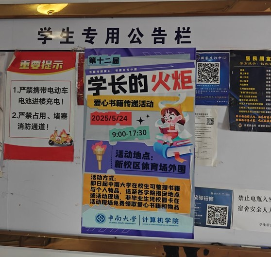自5月14日起至5月23日,学院通过线上线下相结合的方式,全方位宣传“学长的火炬”爱心书籍传递活动。线上,学院官方微信公众号发布活动推文,引发广泛关注和积极转发,文字间流淌着对知识传承的热忱与期待;线下,学工办助理团队深入各宿舍楼张贴海报,走访毕业生宿舍,详细讲解活动意义,发放定制书签,激发了同学们的参与热情,进一步增强了宣传效果。