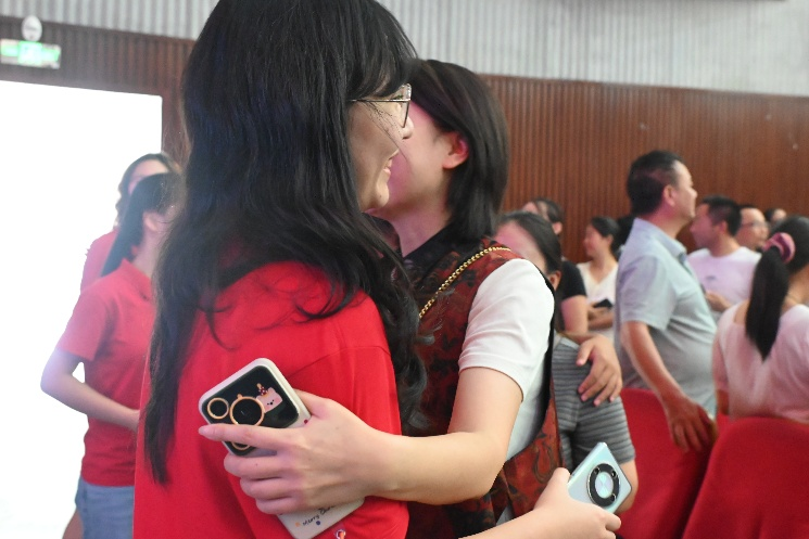 主持人向全体新生发起“新生感恩行动”的倡议,呼吁新生们在未来校园生活中,对楼管阿姨、食堂师傅、保安小哥等服务人员道一声“谢谢”,以尊重彰显教养;从第一堂课起认真听讲,用专注与进步回报师恩;同时,鼓励新生走向现场的父母,将提前写好的感恩卡片交给他们,并真诚地道出“谢谢你们”。现场温情满满,掌声不断。