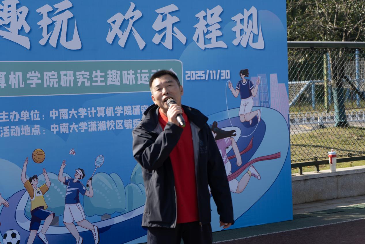 11月30日下午14:30,趣味运动会开幕式准时举行。主持人徐韬纬首先对本次运动会的比赛项目、流程安排及安全注意事项作了详细介绍,引导参赛同学有序参与。随后,学院党委副书记王新辉发表致辞,他强调体育锻炼对研究生身心健康的重要意义,鼓励同学们将赛场上的协作精神与拼搏劲头融入科研与生活,在运动中收获友谊、锤炼意志、强健体魄。