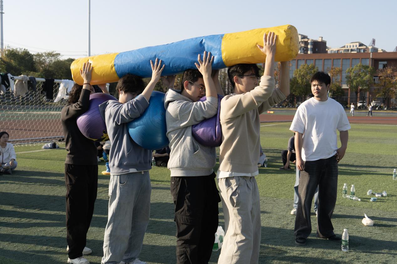 本次运动会设置了携手并进、巨人脚步、同心协力、十指同心、围圈立柱、拔河对抗赛六大趣味项目,兼顾竞技性与趣味性,全面考验团队的默契与协作能力。比赛中,参赛队员们精神抖擞、奋勇争先。“携手并进”项目里,大家手持圆柱、夹球接力,步伐稳健显默契;“巨人脚步”赛道上,队员们绑着弹力带同步前行,“一二”口号声回荡赛场;拔河对抗赛更是将氛围推向高潮,双方队员紧握绳索、奋力后拉,场外加油声、呐喊声此起彼伏。各个项目精彩纷呈,同学们在欢笑与拼搏中增进了情谊,凝聚了力量。
