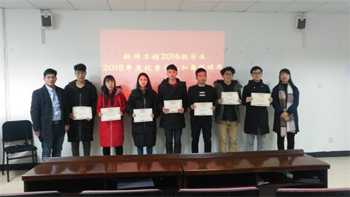 会议最后,进行计算机学院软件工程2016级2018年度优秀个人和集体颁奖仪式,奎院长、师主任、费老师以及谢老师为获奖的同学和班级颁奖并合影纪念。