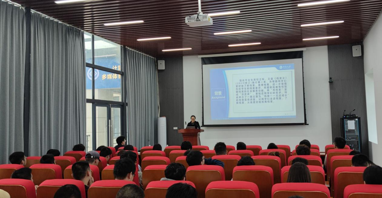 值此毕业生离校之际,又逢《档案法》(2020修订)施行第一年,为增强在校学生的档案意识,帮助同学们更好地了解档案,使用档案。计算机学院于2021年5月22日在新校区信息楼5楼报告厅开展了主题为“档案一一见证成长”的档案专题讲座,主讲嘉宾为学校档案馆周新宏副馆长。学院就业专干李诚老师,档案专干李若楠老师,17级、19级、20级主要学生干部参与了本次讲座。
