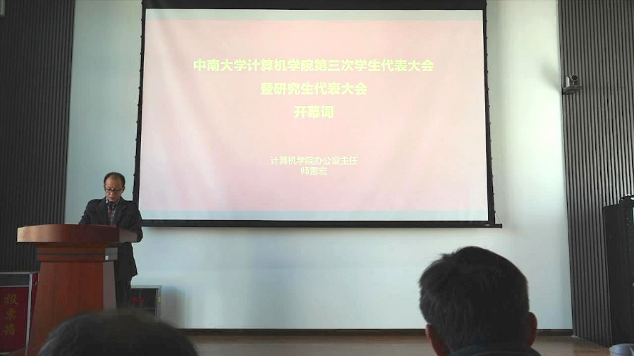 大会第二项,师雷宏主任致开幕词。师雷宏向一直以来关心、支持william威廉英国官网计算机学院学生会、研究生会工作的上级团组织、学生会组织表达了衷心的感谢。他在致辞中呼吁各位代表同心协力,以饱满的热情,认真履行职责,集思广益,群策群力,圆满完成本次大会各项议程和任务。