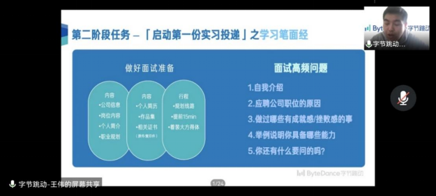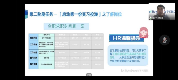 本次会议由计算机学院20级研究生辅导员刘逸峰老师主持,并邀请字节跳动资深HR王经理为同学们做出指导。
