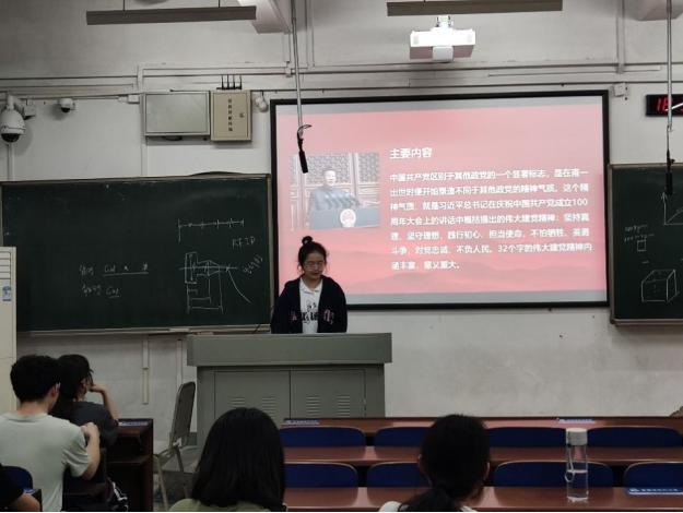 研讨会的第一部分,宋佳雯对习总书记在建党一百周年大会的讲话进行了重点解读,帮助同志们更加深刻地理解伟大建党精神,提升自己的党性,端正自己的入党动机,并让同学们对于“不怕牺牲,英勇斗争”“对党忠诚,不负人民”等伟大建党精神有了更清晰的认知。