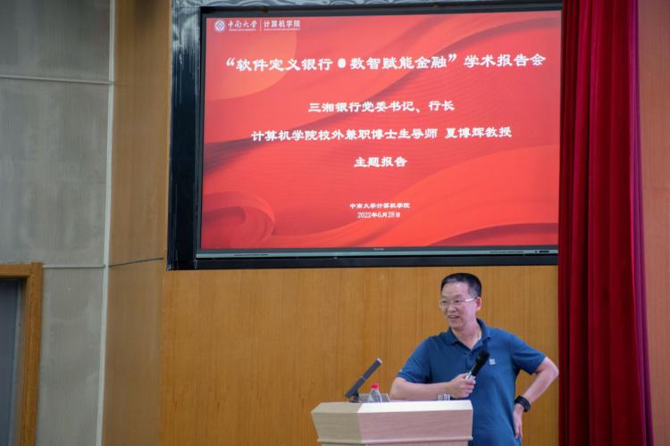 2022年6月28日下午16:30,湖南三湘银行党委书记、行长夏博辉教授受邀前来计算机学院在新校区信息楼报告厅开展以“软件定义银行,数智赋能金融”为主题的学术报告会。与会的嘉宾有三湘银行副行长宋志明,人力资源部部长徐力,科技管理部高级专家路博,团委书记、行长秘书屈贝尔,学院院长王建新教授到会,参与此次报告会的还学院的教师代表、硕士和博士生代表。会议由学院副院长李敏教授主持。