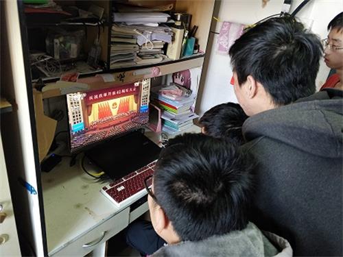 与此同时,所有本科生以寝室为单位,在没有课程安排的情况下,由寝室长组织观看大会直播,而有课程安排的同学们,也都在课程结束后第一时间观看直播,并由寝室长安排时间补看了直播回放。每个寝室都有专人负责对会议内容进行记录,直播结束后,不同寝室之间也就会议内容进行了探讨。