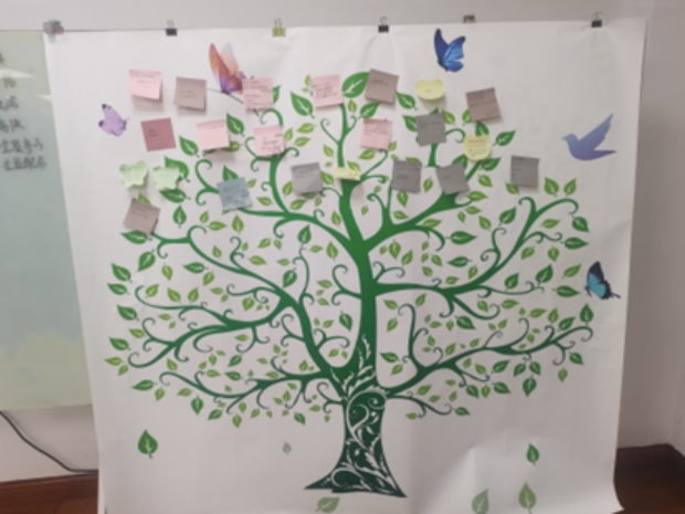 从热身活动的转圈活跃气氛,到写下对此次活动的期望,同学们的积极性逐渐被调动起来,于欢声笑语中迎接接下来的活动。我们看到同学们于“滚雪球”中将目光聚焦于平常或许有些陌生的同窗身上,去认真记下他们的姓名与籍贯;亦看见“心有千千结”中的通力合作,为解开一个结而共同苦苦思索,甚至改变全班同学站位;也听到我们诉下的“酸甜苦辣”,品味到大学的生活或许并不如想象中那般一帆风顺,且去将经历的苦与甘尽数化为前行的经验。同学们于便签上一笔一划写下自己的理想追求贴于心愿树上,期盼着通过自己的不懈努力,去迎接成长与蜕变,收获结下的累累硕果。